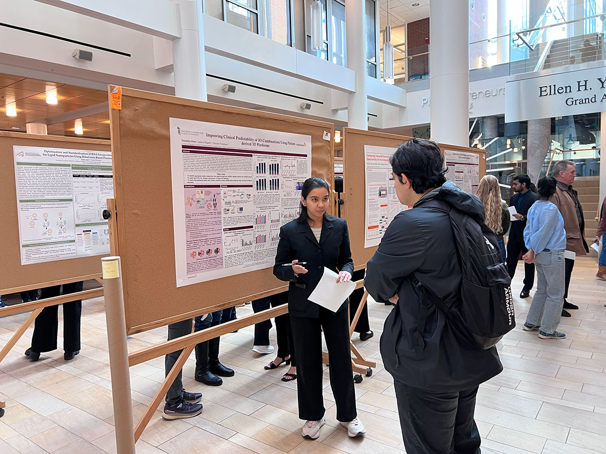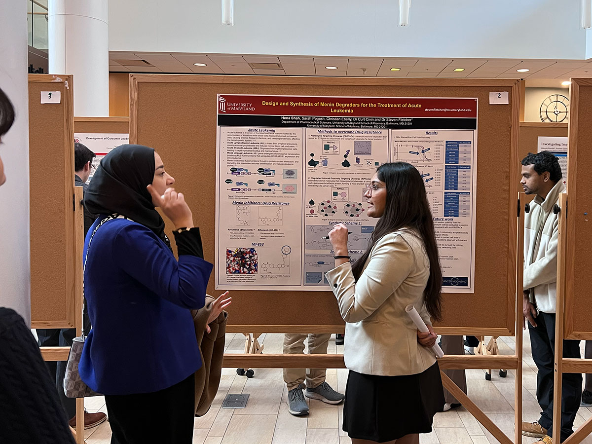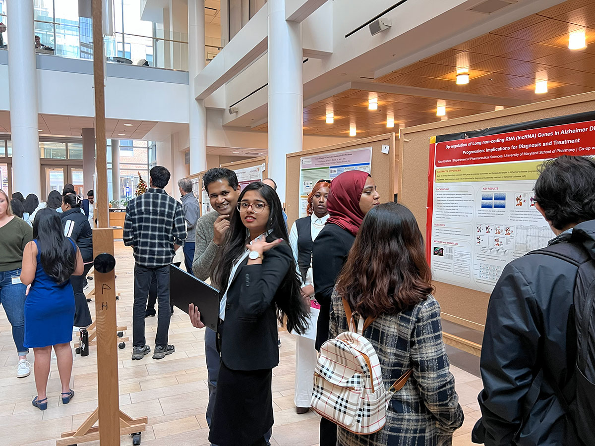 Students in the Master of Science in Pharmaceutical Sciences (PharmSci) program at the University of Maryland School of Pharmacy (UMSOP) presented their capstone research projects during a poster session Dec. 12 in Pharmacy Hall. The event marked the culmination of the rigorous 16-month MS program, which blends advanced coursework with hands-on research and industry experience. The program has grown from an inaugural cohort of approximately three students to its largest class to date, with 36 students in the current cohort.